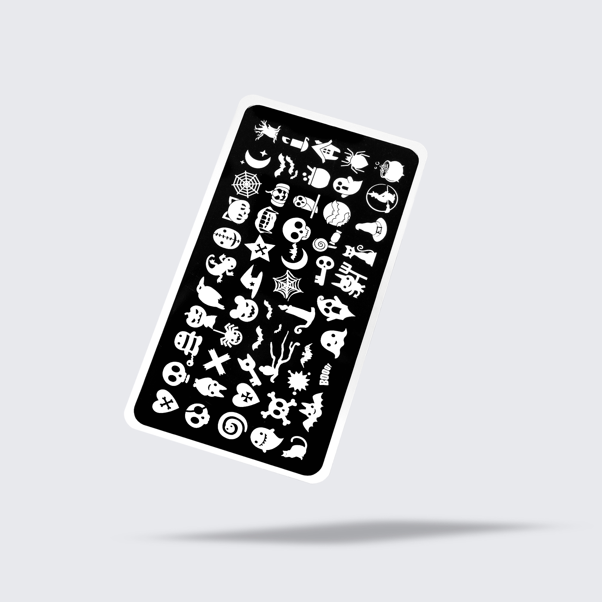 Think classic Halloween imagery in a cute, cartoonish style. This stamping plate serves you smiley skulls, ghosts, crescent moons, mythical creatures & beyond.
